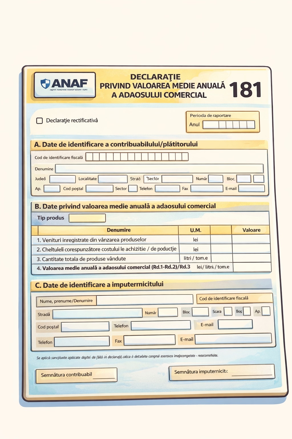 Ordinul Agenției Naționale de Administrare Fiscală nr. 412 din 30 martie 2026, publicat în Monitorul Oficial nr. 254 din 31 martie 2026, introduce formularul 181 „Declarație privind valoarea medie anuală a adaosului comercial”, document care devine obligatoriu pentru operatorii din piața carburanților.