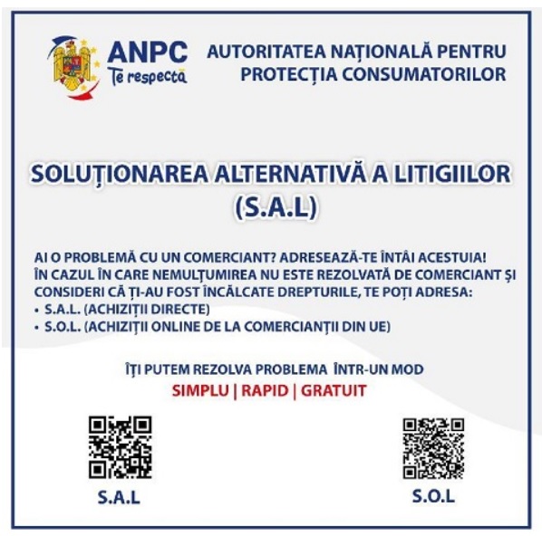 Pentru a asigura accesul facil al consumatorilor la entitatea de soluţionare alternativă a litigiilor din cadrul Autorităţii Naţionale pentru Protecţia Consumatorilor şi la procedurile de soluţionare alternativă a litigiilor - procedurile SAL, în vederea soluţionării alternative a reclamaţiilor acestora, comercianţii au obligaţia să afişeze placheta informativă prevăzută în anexa nr. 1 la ordin.