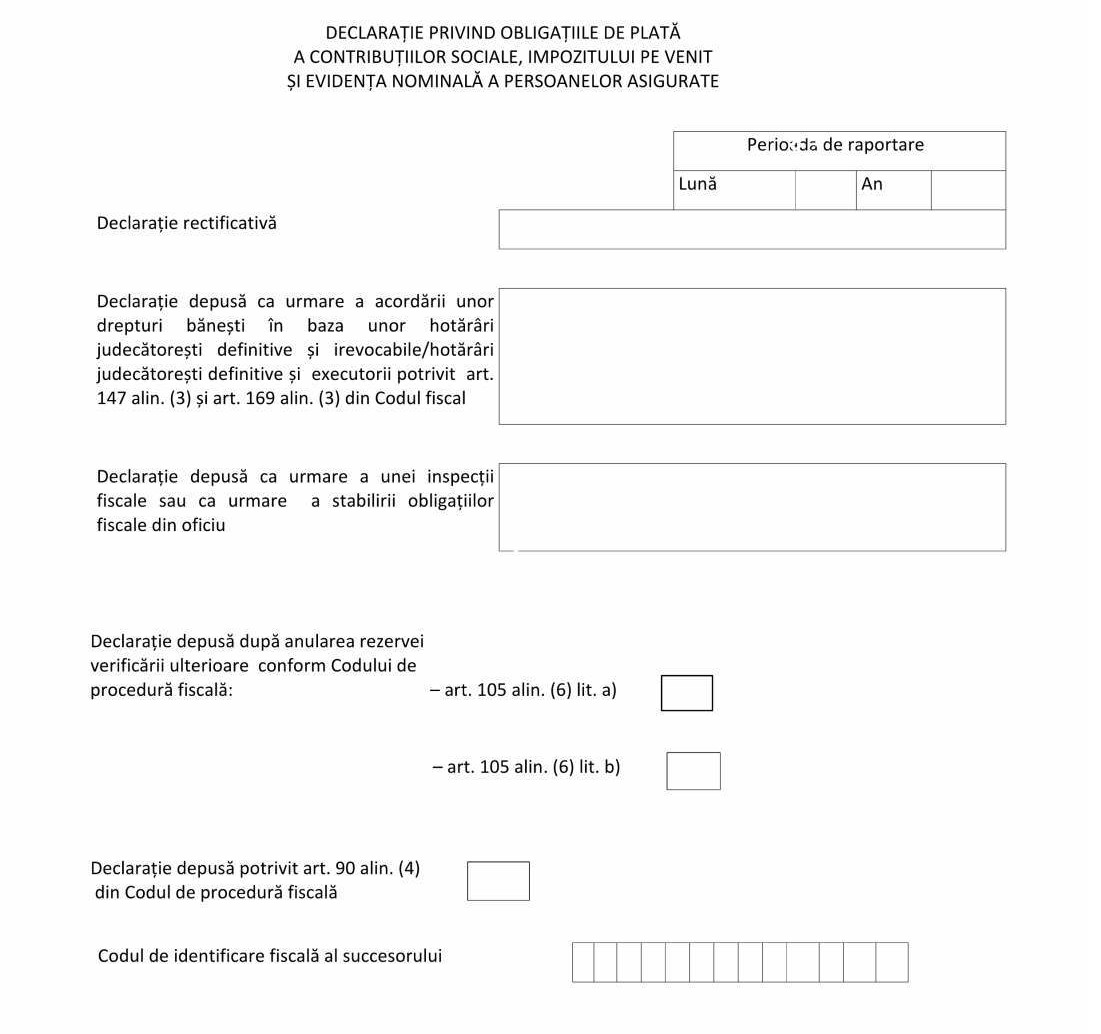 - Caseta „Declaraţie depusă ca urmare a acordării unor sume reprezentând salarii sau diferenţe de salarii/solde stabilite prin lege, potrivit art. 147 alin. (3^1) şi art. 169 alin. (3^1) şi (3^2) din Codul fiscal“- se bifează cu X în situaţia în care declaraţia se rectifică în urma acordării unor sume reprezentând salarii sau diferenţe de salarii/solde stabilite prin lege, acordate pentru perioade anterioare. Se întocmesc declaraţii rectificative corespunzătoare fiecărei luni (corelare cu anexa nr. 1).