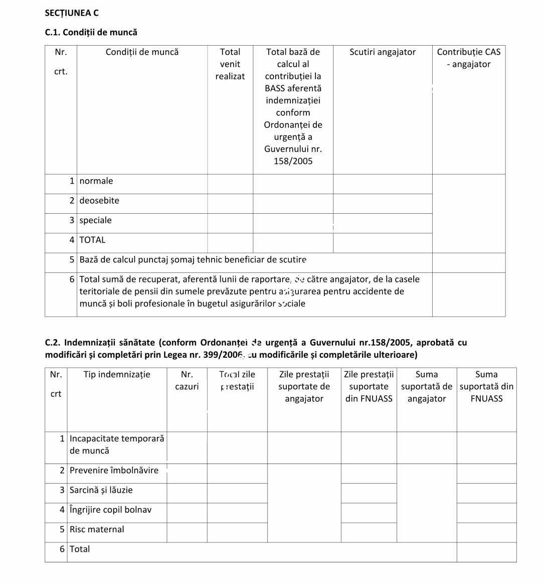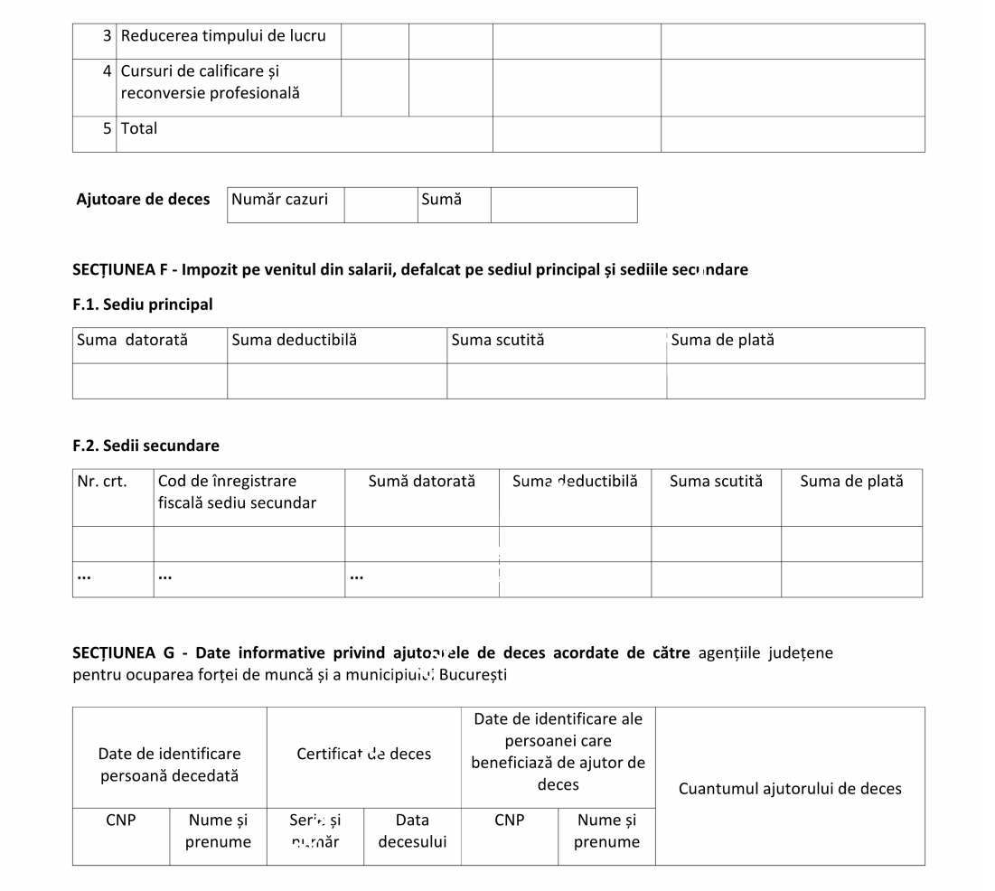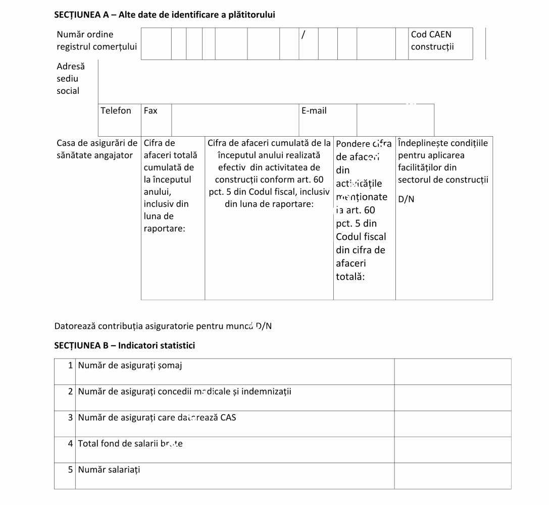 Declaraţia se completează şi de angajatorii prevăzuţi la art. 60 pct. 5 din Codul fiscal, care desfăşoară una sau mai multe activităţi şi în domeniile de activitate prevăzute la art. 60 pct. 5 din Codul fiscal şi îndeplinesc condiţiile privind acordarea facilităţilor fiscale privind scutirea angajaţilor de la plata impozitului pe venit şi contribuţiilor de asigurări sociale de sănătate, reducerea cotei contribuţiei de asigurări sociale, reducerea cotei de contribuţie asiguratorie pentru muncă datorată de angajator la nivelul cotei care se face venit la Fondul de garantare pentru plata creanţelor salariale constituit în baza Legii nr. 200/2006 privind constituirea şi utilizarea Fondului de garantare pentru plata creanţelor salariale, cu modificările ulterioare, precum şi scutirea de la plata contribuţiilor de asigurări sociale datorate de angajatori, în cazul condiţiilor deosebite de muncă sau în cazul condiţiilor speciale de muncă.