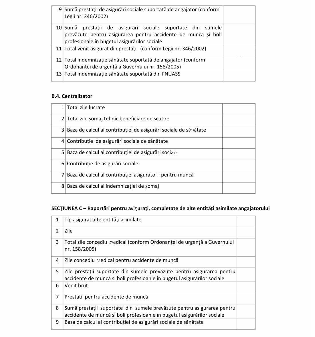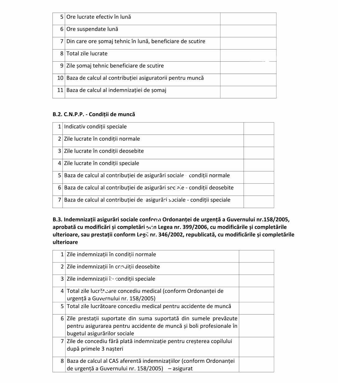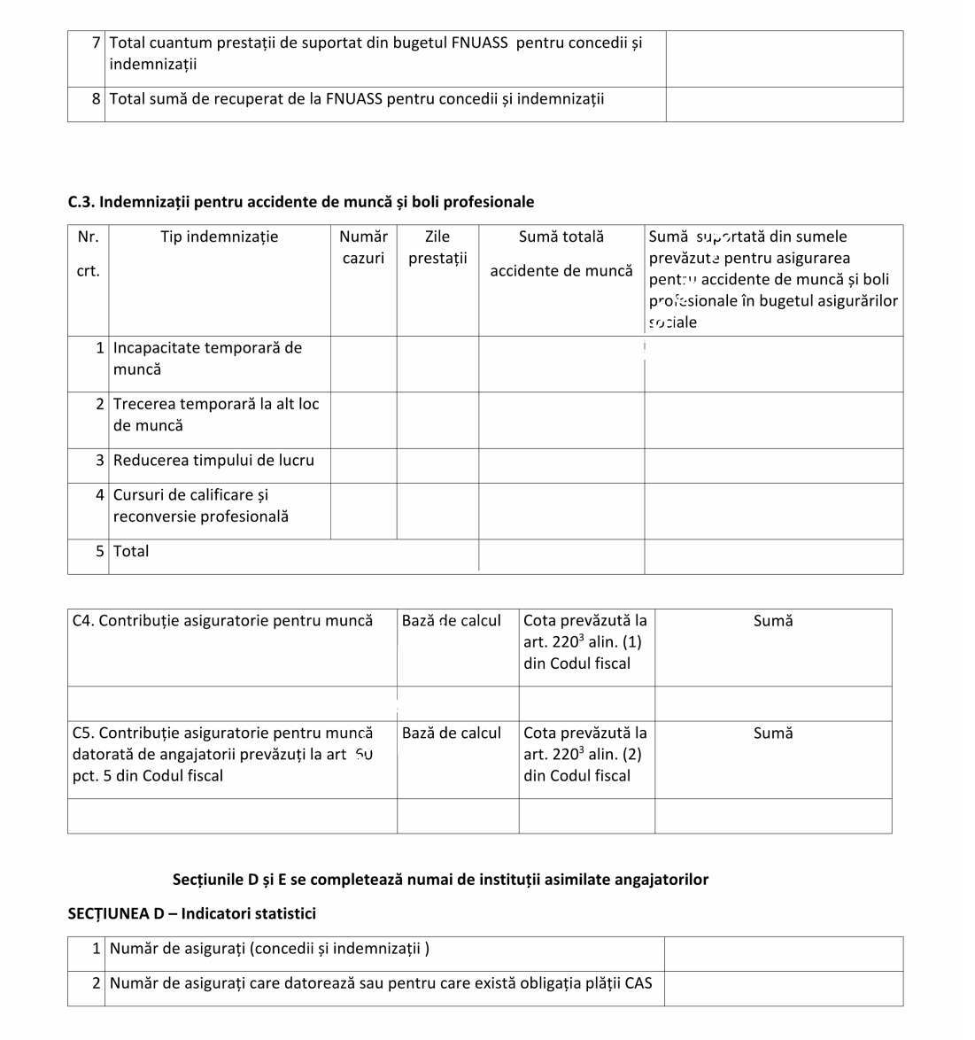 Declaraţia se completează şi de angajatorii prevăzuţi la art. 60 pct. 5 din Codul fiscal, care desfăşoară una sau mai multe activităţi şi în domeniile de activitate prevăzute la art. 60 pct. 5 din Codul fiscal şi îndeplinesc condiţiile privind acordarea facilităţilor fiscale privind scutirea angajaţilor de la plata impozitului pe venit şi contribuţiilor de asigurări sociale de sănătate, reducerea cotei contribuţiei de asigurări sociale, reducerea cotei de contribuţie asiguratorie pentru muncă datorată de angajator la nivelul cotei care se face venit la Fondul de garantare pentru plata creanţelor salariale constituit în baza Legii nr. 200/2006 privind constituirea şi utilizarea Fondului de garantare pentru plata creanţelor salariale, cu modificările ulterioare, precum şi scutirea de la plata contribuţiilor de asigurări sociale datorate de angajatori, în cazul condiţiilor deosebite de muncă sau în cazul condiţiilor speciale de muncă.