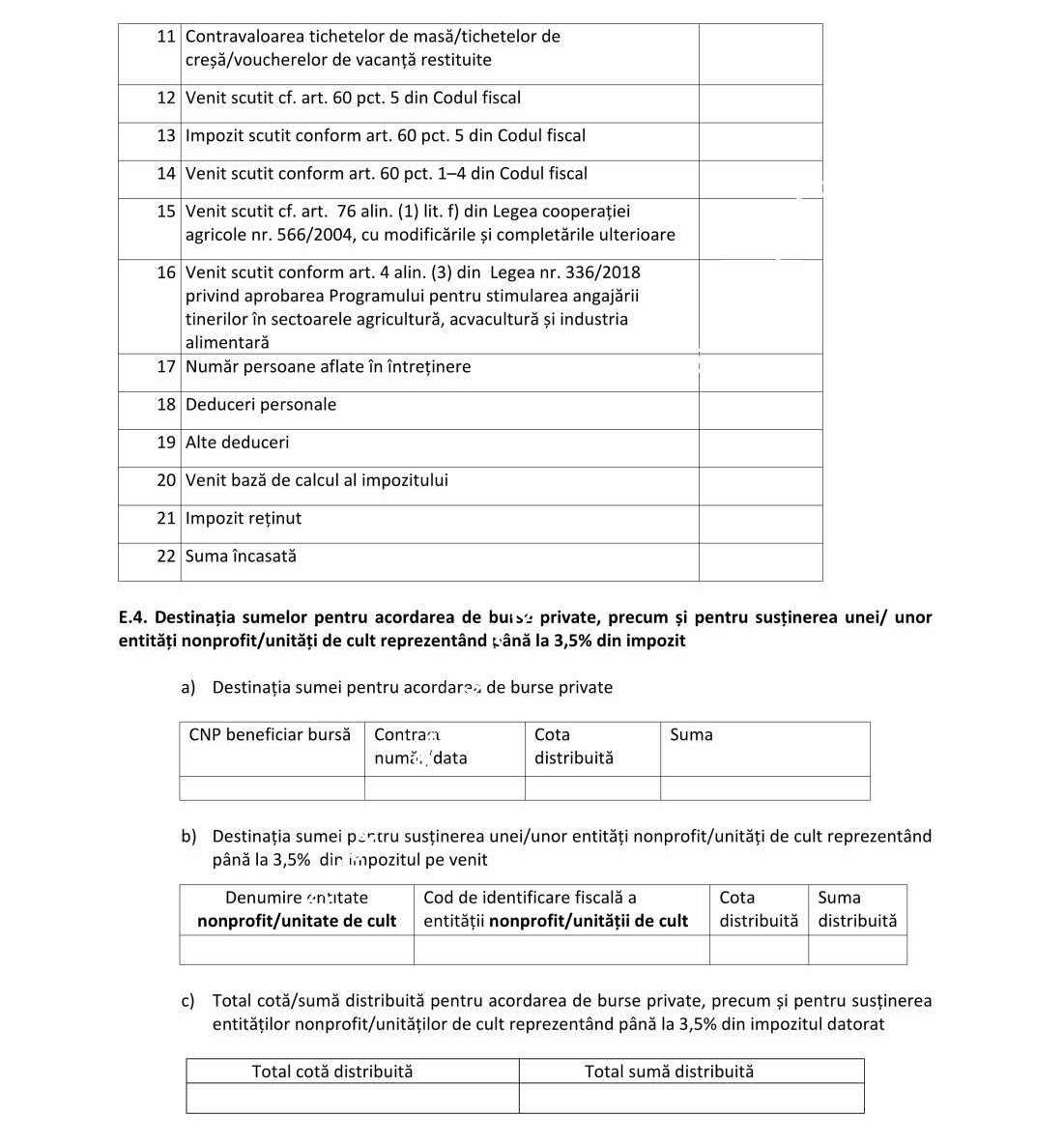 Declaraţia se completează şi de contribuabilii prevăzuţi la art. 147 alin. (12) şi (13), art. 151 alin. (5) şi (6), art. 168 alin. (2), art. 169 alin. (1) lit. b) şi art. 174 alin. (5) şi (6) din Codul fiscal, care au obligaţia să depună declaraţia şi să achite contribuţiile sociale obligatorii, potrivit legii, precum şi de plătitorii de venit prevăzuţi la art. 68^1 alin. (2), art. 72 alin. (2), art. 84 alin. (8) şi art. 125 alin. (8)-(9) din Codul fiscal.