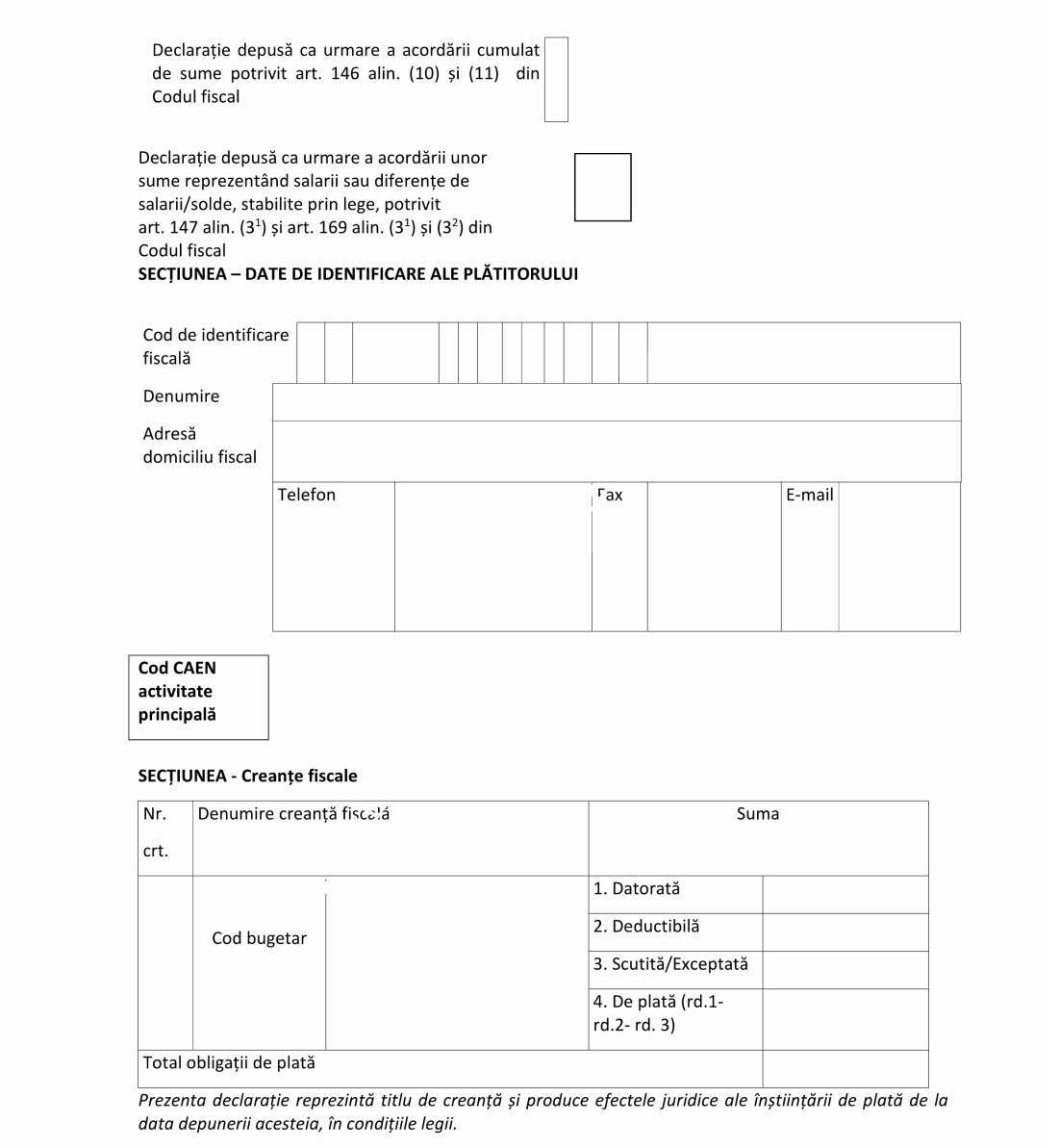 - Caseta „Declaraţie depusă potrivit art. 90 alin. (4) din Codul de procedură fiscală“ - se bifează cu X în situaţia îndeplinirii, de către succesorii persoanelor/entităţilor care şi-au încetat existenţa, a obligaţiilor fiscale aferente perioadelor în care persoana/entitatea a avut calitatea de subiect de drept fiscal. În această situaţie se înscrie codul de identificare fiscală al succesorului. De asemenea, la secţiunea „Date de identificare a plătitorului“, la rubrica „cod de identificare fiscală“ se înscrie codul de identificare fiscală radiat, potrivit art. 90 alin. (4) din Codul de procedură fiscală.